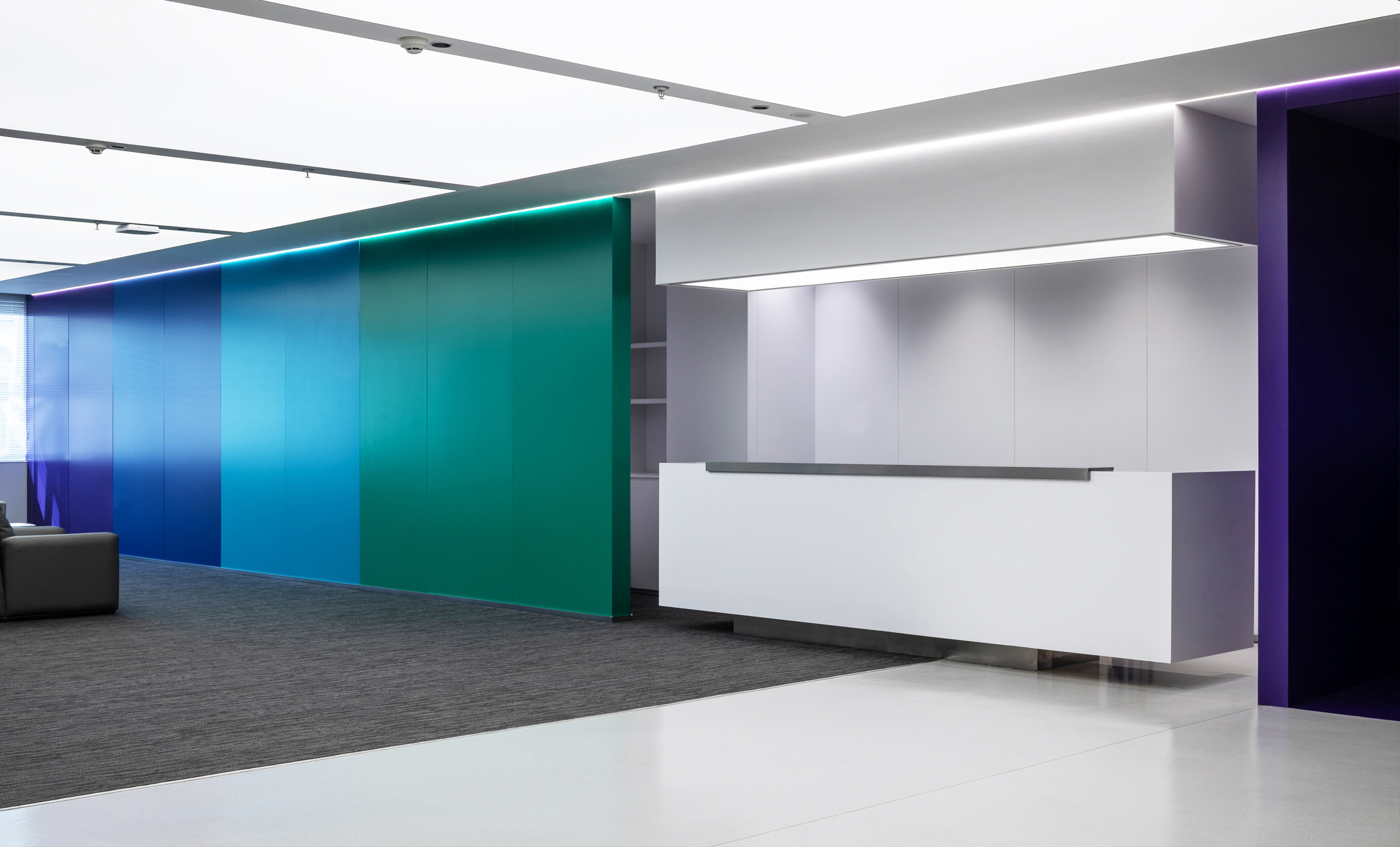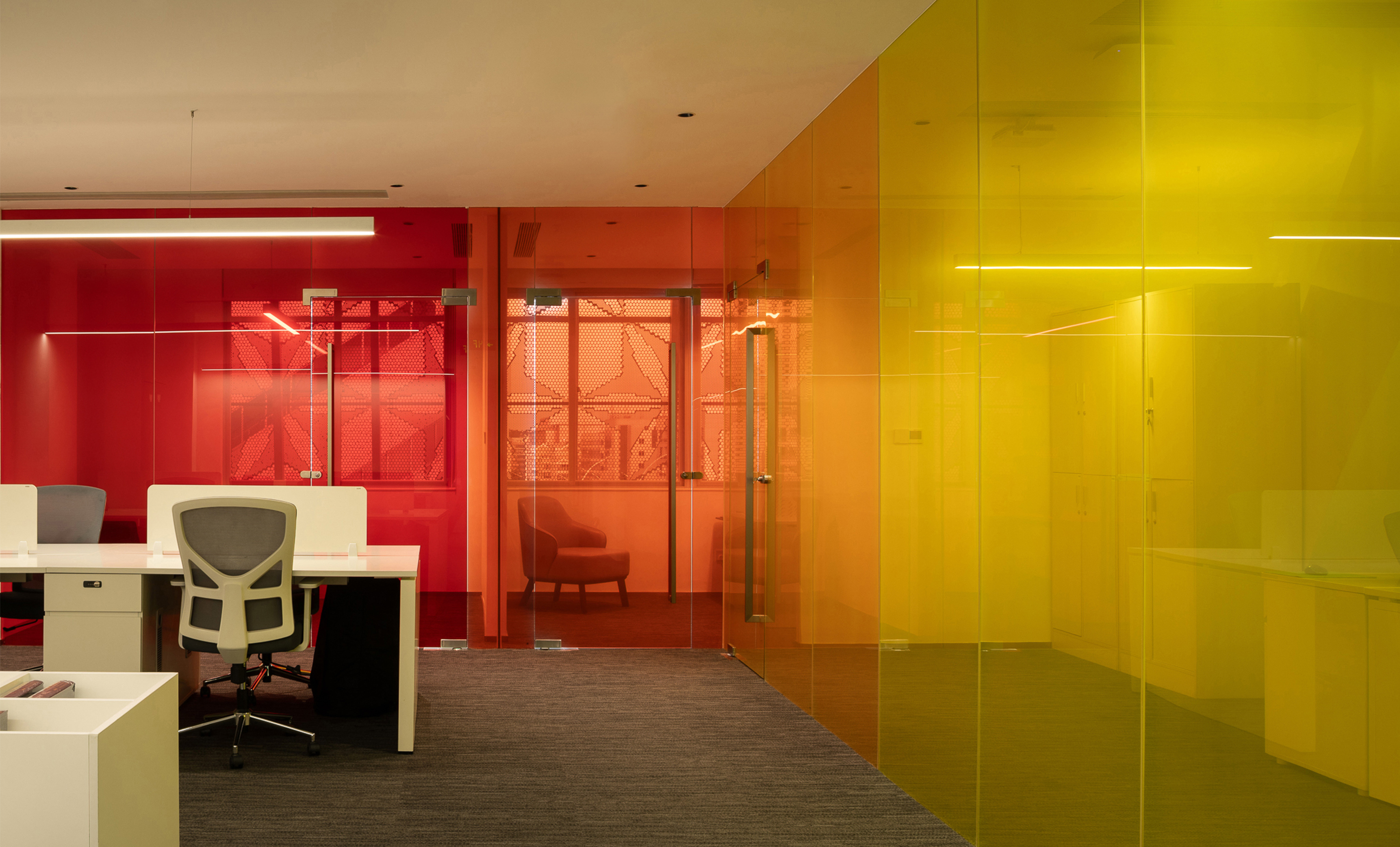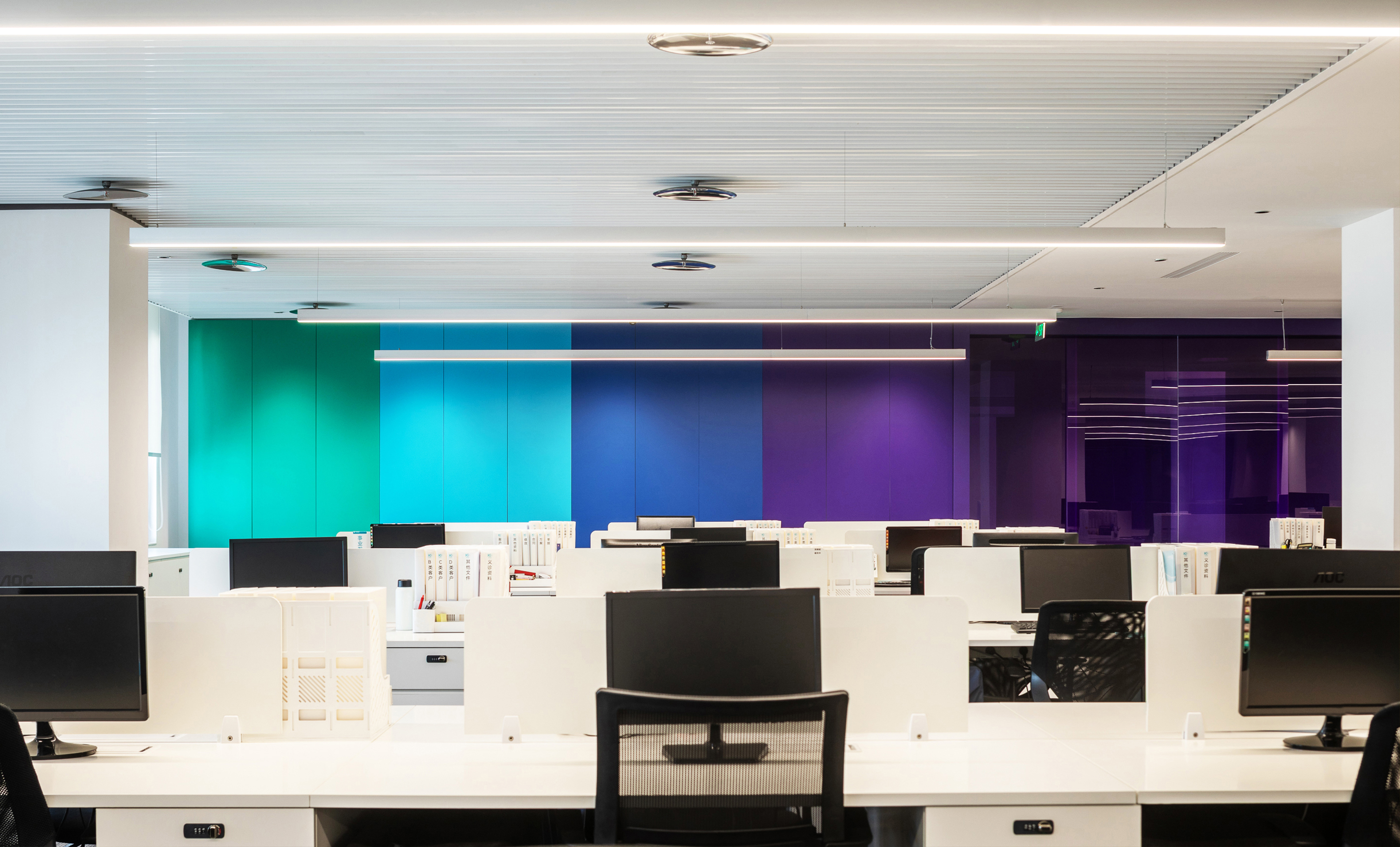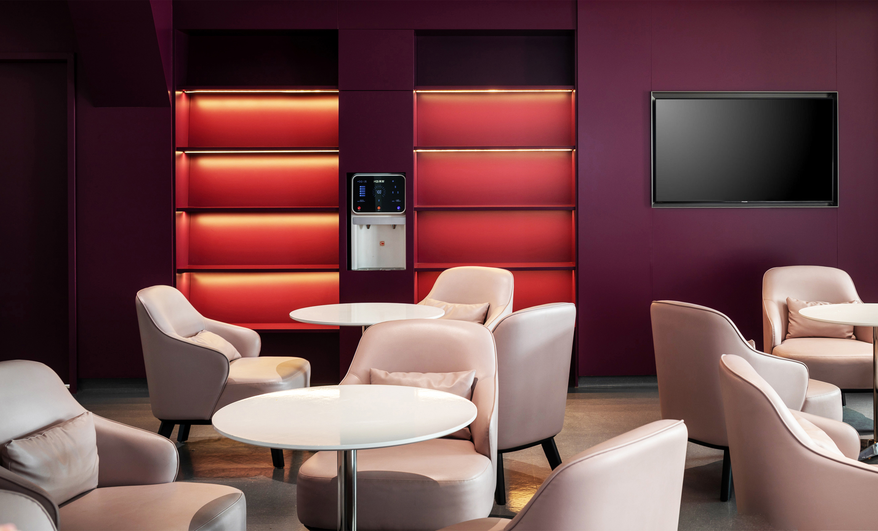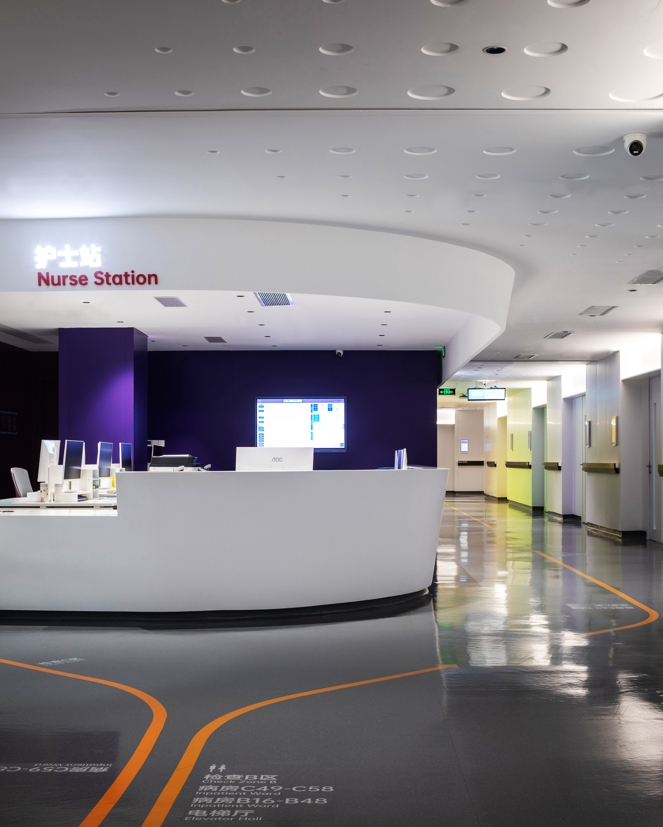 To mitigate the oppressive feel of the building's slanted steel structure, all spatial volumes and furniture follow the architectural language by adopting curved forms. This is paired with rich color-coded functional zones, which break the sense of enclosure from partition walls, infuse a soft ambiance, convey a warm texture, and alleviate the tense atmosphere typical of hospital environments.