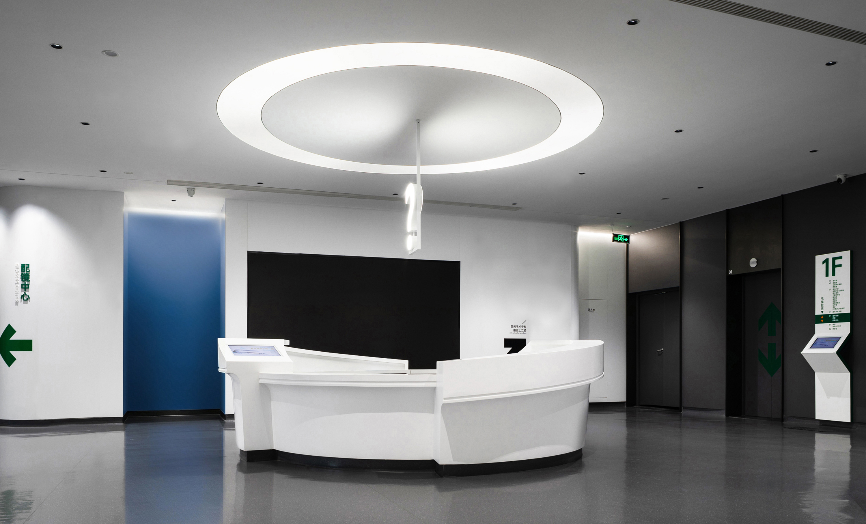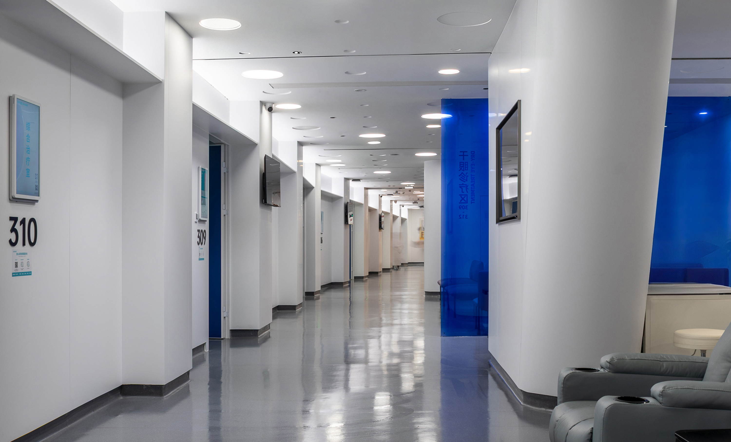 科宏眼科医院位于厦门市湖里区嘉禾新天地,原为半围合式商业综合体,其复杂的楼面平台、楼梯与体量交错结构,为融入医疗功能带来挑战。