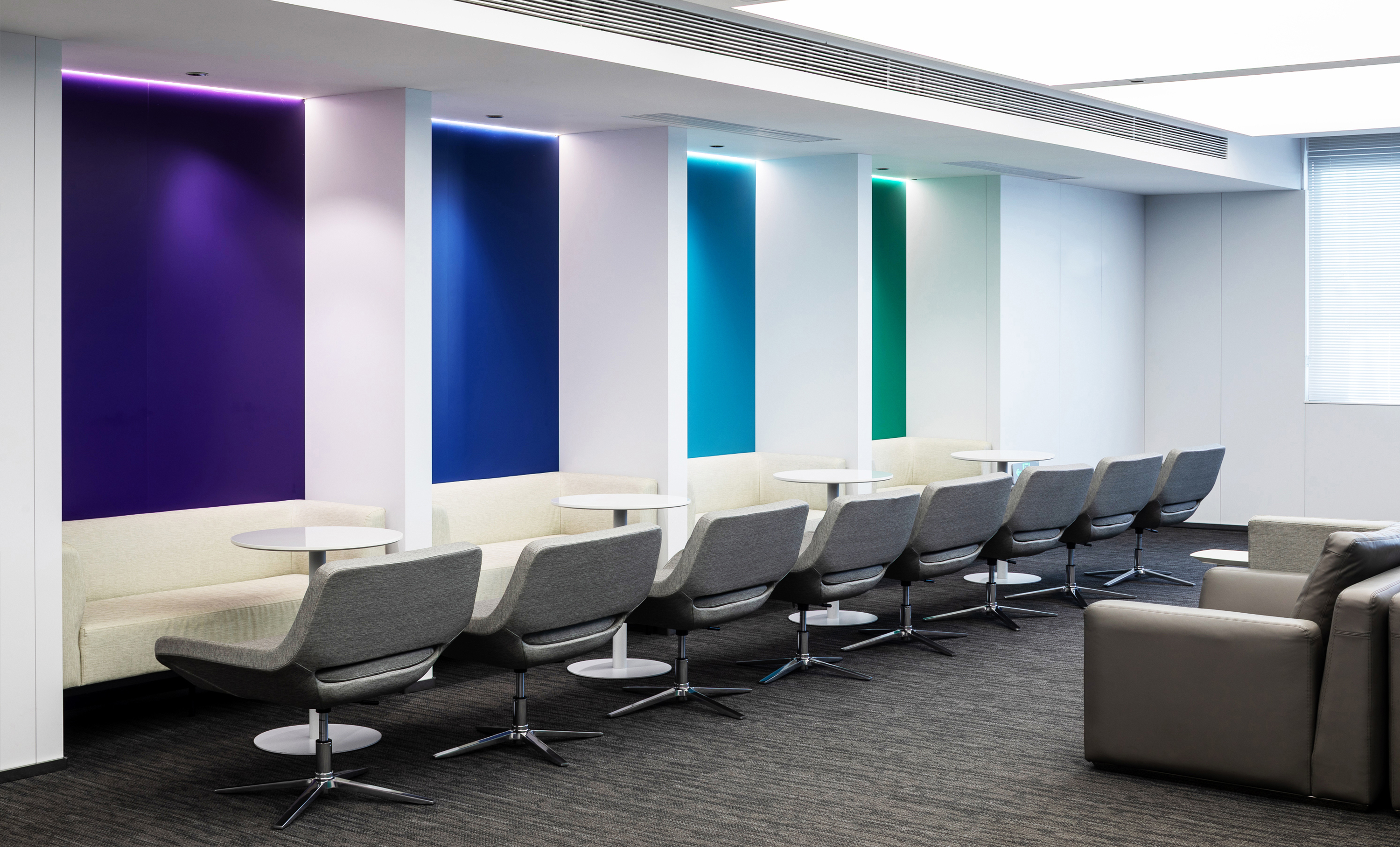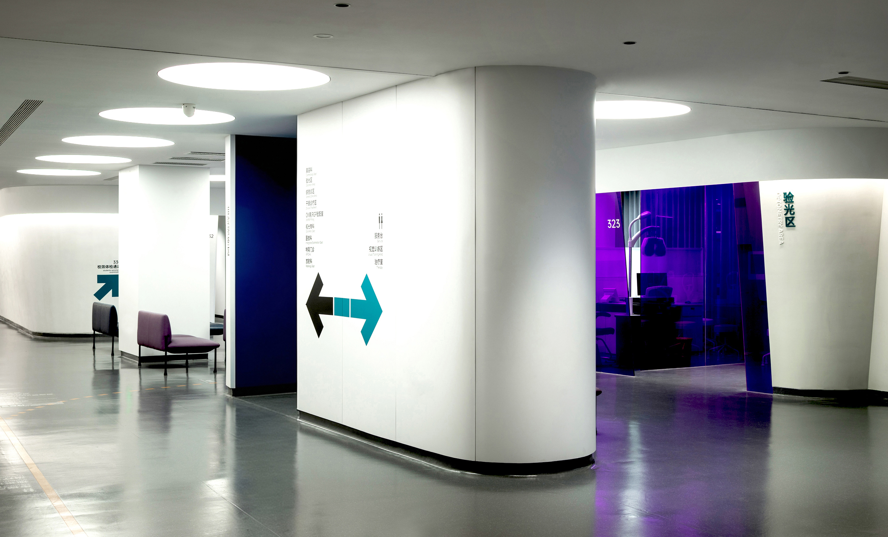 为弱化建筑斜向钢结构的压迫感,所有空间体块、家具均依循建筑语汇采用圆弧造型,搭配丰富的色彩功能分区,打破隔墙封闭感,注入柔和氛围,传递温暖质感,缓解医院环境紧张氛围。