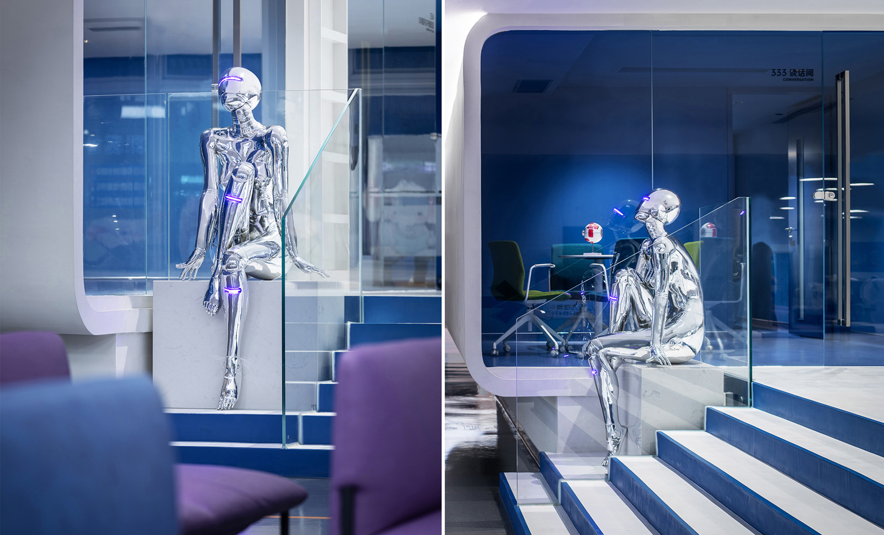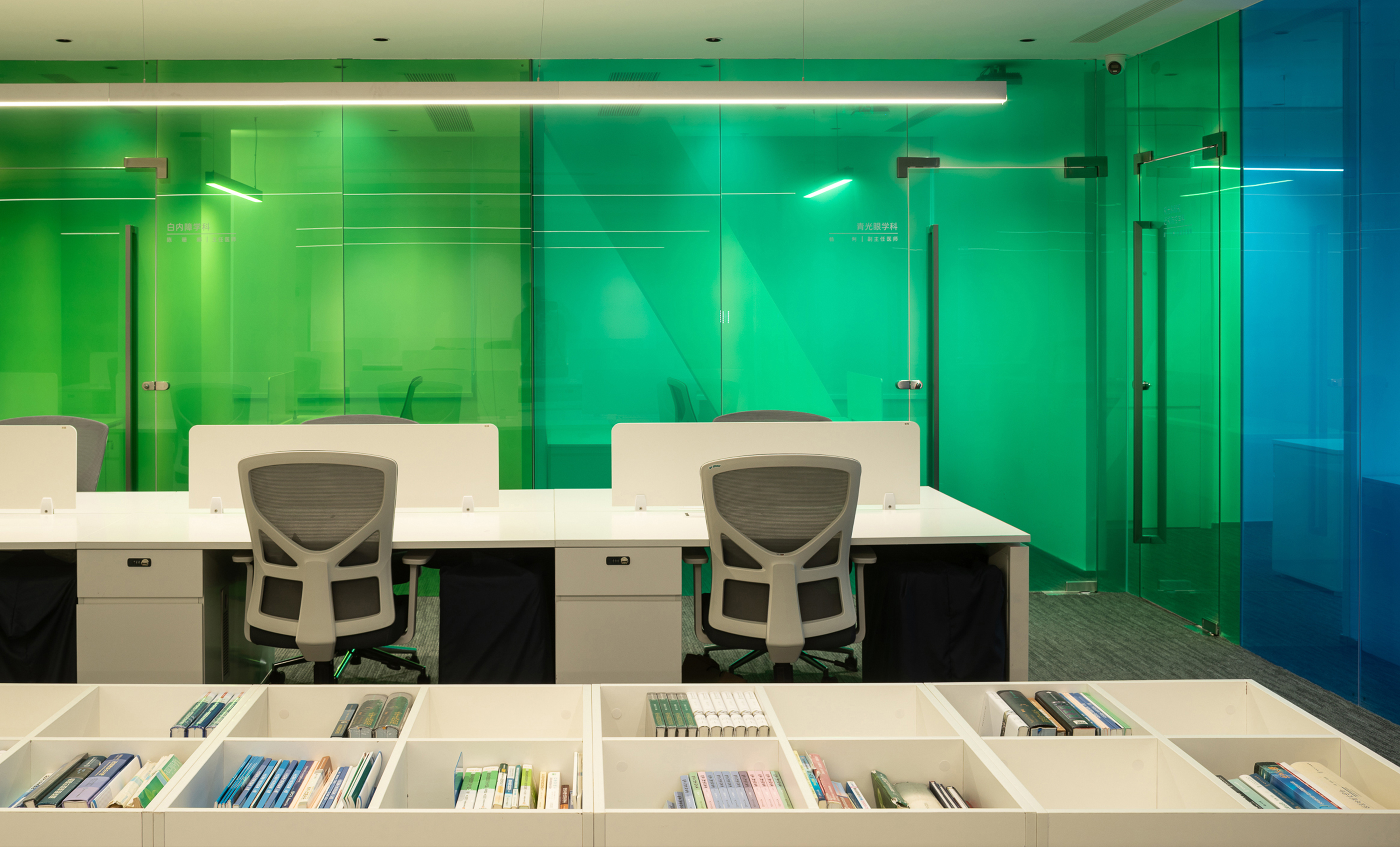 On the first floor, along the main street-facing facade, we established a premium eyewear display and sales area. Utilizing blue-green gradient glass display shelves, we softened the starkness of the glass curtain wall. Under the shifting natural light, the unique interplay of light, shadow, and color composition attracts customers to pause, take photos, and share their experiences. This has effectively enhanced the hospital's visibility on social media and bolstered its brand image.