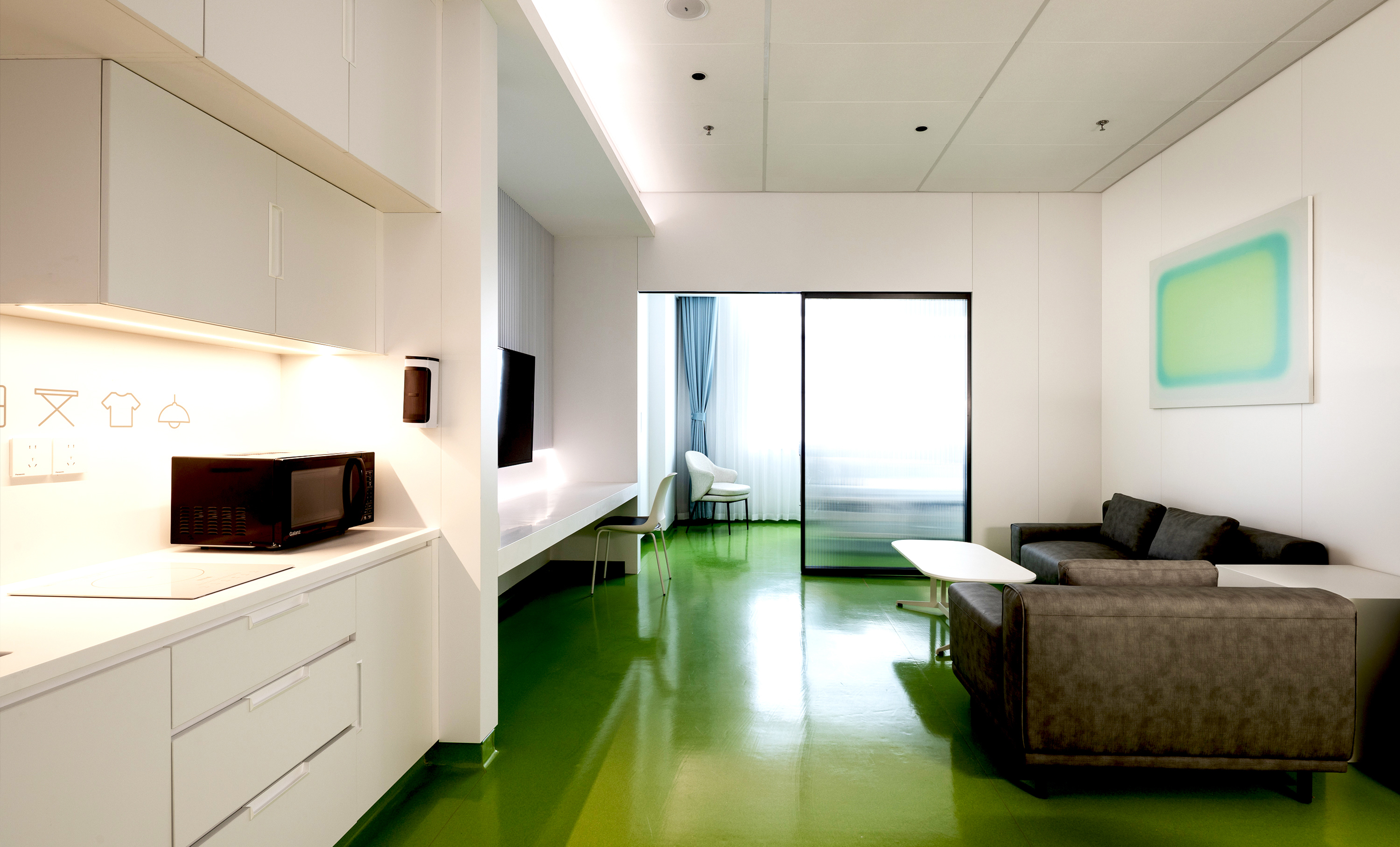 在病房楼层,我们挖掘建筑特征与层高优势,适度保留原有结构关系,并通过艺术化设计将结构与护理站结合,形成独特的室内造型语汇,以明快色彩构成病房楼层公共区域,将住院转化为趣味体验,消除患者与医护人员之间的隔阂,使单调的住院生活变得生动而有趣。