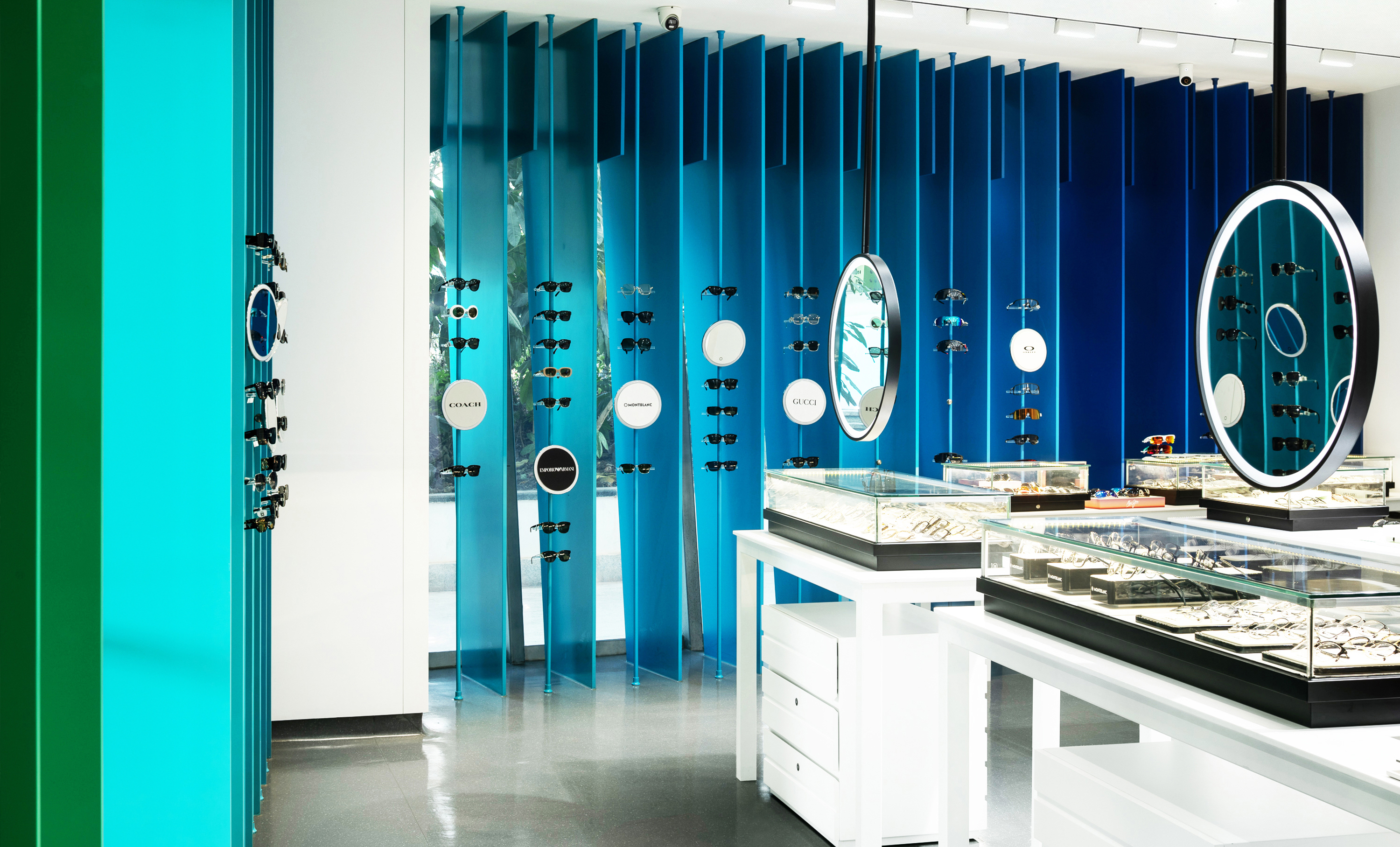 我们在一楼沿街主立面设精品眼镜展售区,采用蓝绿渐变玻璃展架,弱化玻璃幕墙生硬感。在自然光影变化下,凭借独特的光影与色彩构成,吸引顾客驻足拍照分享,有效提升了医院在社交媒体的传播度与品牌形象。