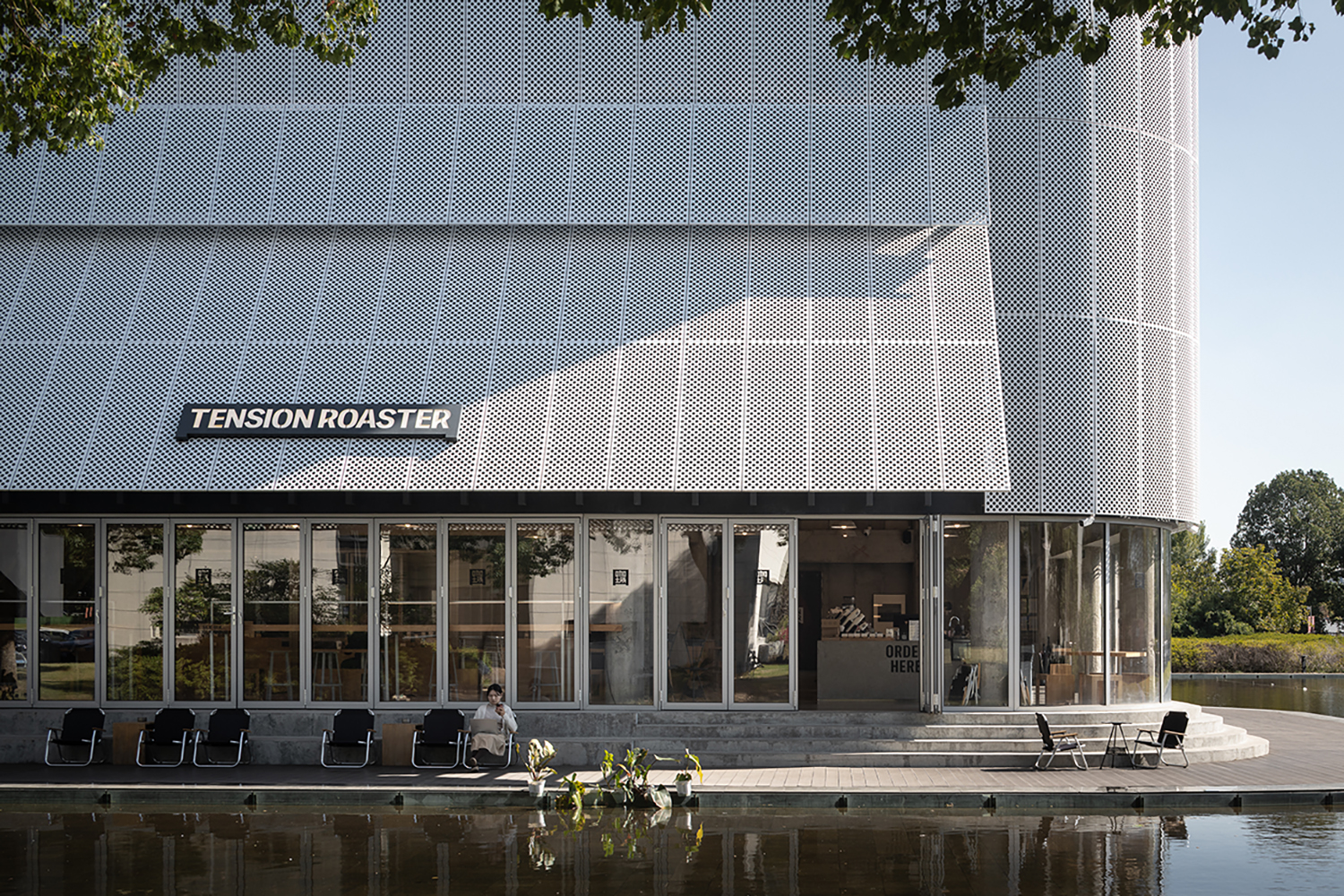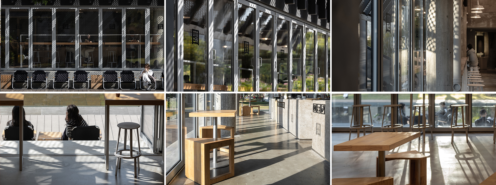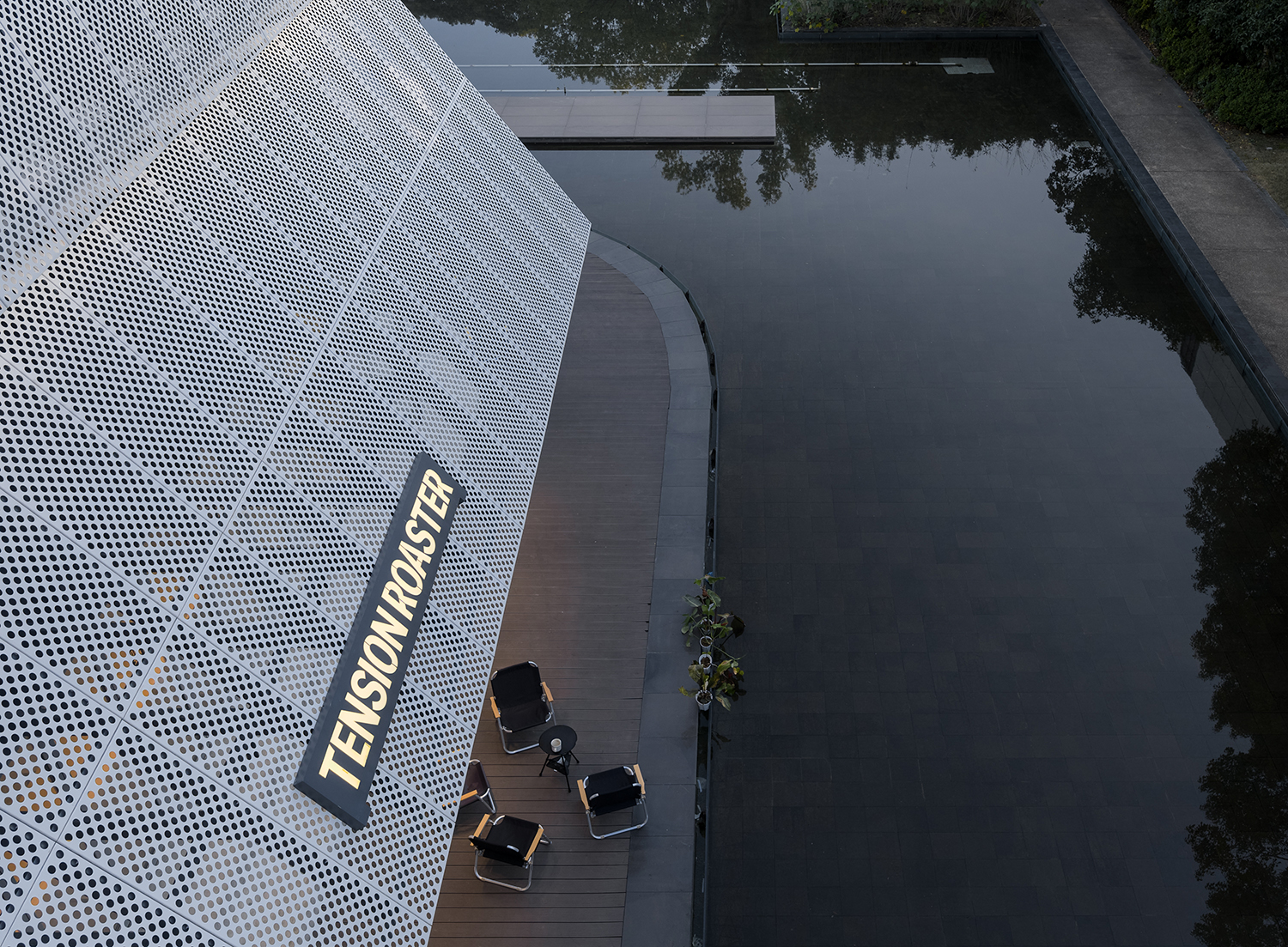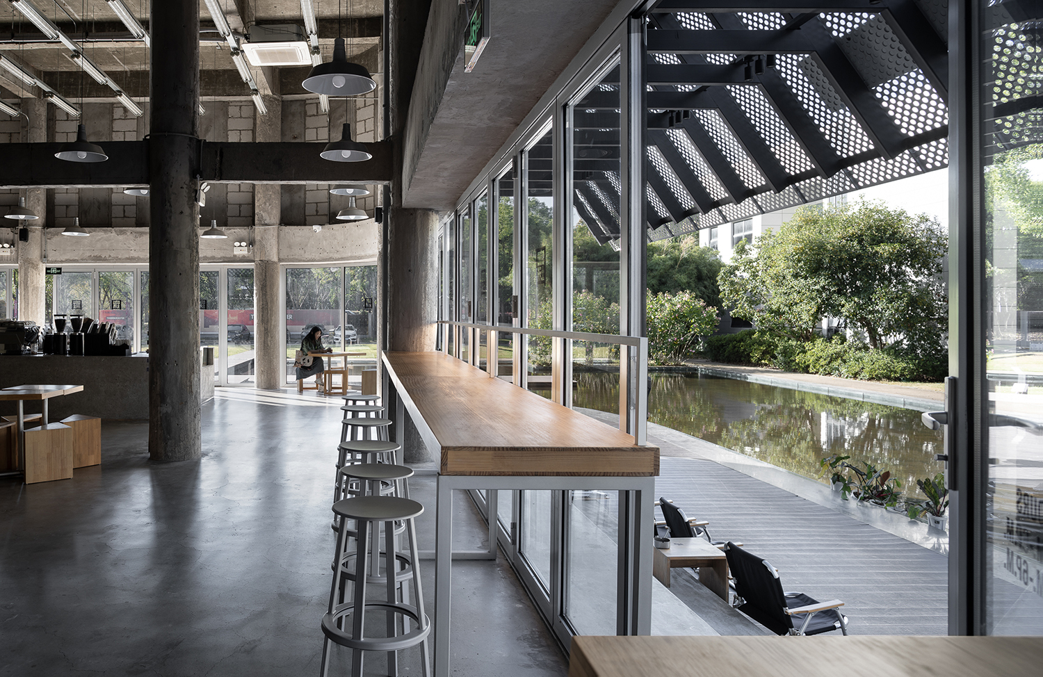 大面积的玻璃折叠门除了引入充足的自然光线,让室内外空间相互渗透融合,水池、外摆平台、檐下空间、点单区、内用区、咖啡烘焙区,空间关系由开放层层递进到私密、满足不同人群的社交需求。