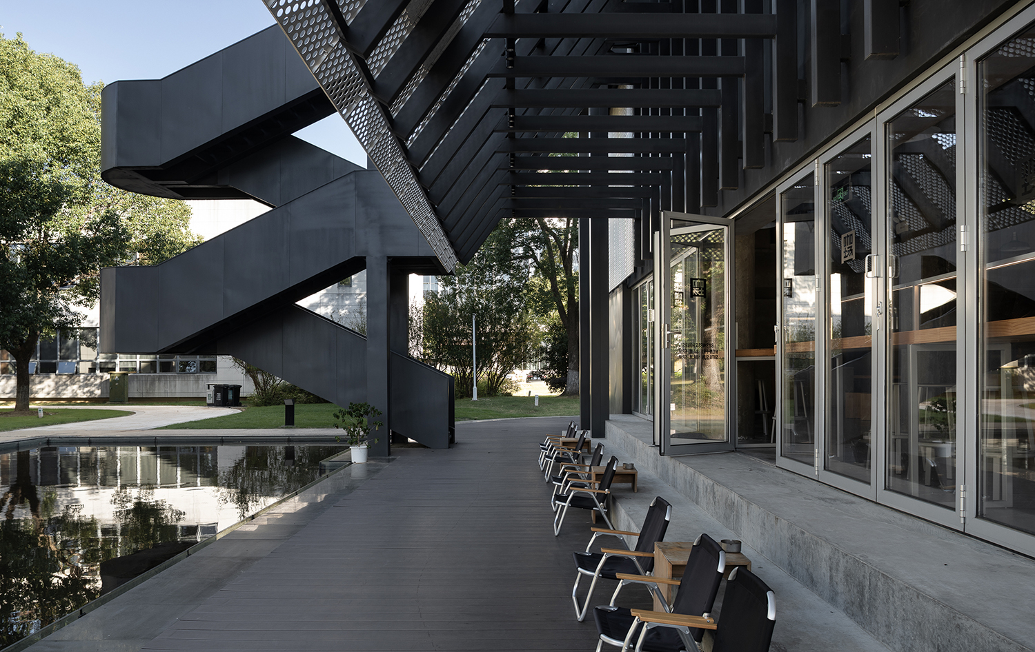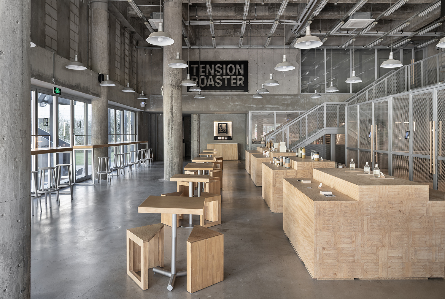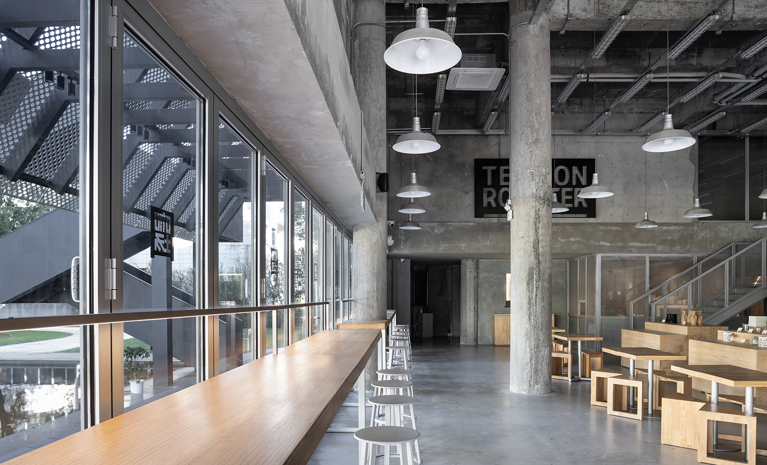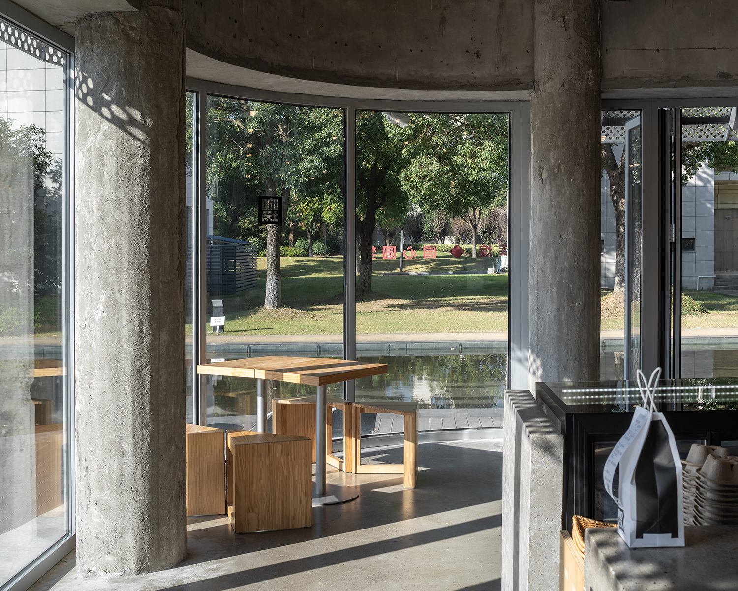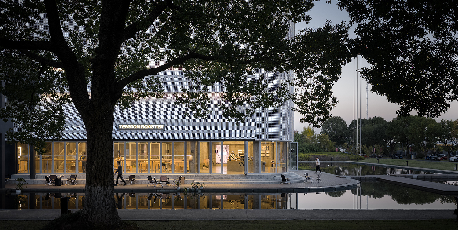 大面积的玻璃折叠门除了引入充足的自然光线,让室内外空间相互渗透融合,水池、外摆平台、檐下空间、点单区、内用区、咖啡烘焙区,空间关系由开放层层递进到私密、满足不同人群的社交需求。