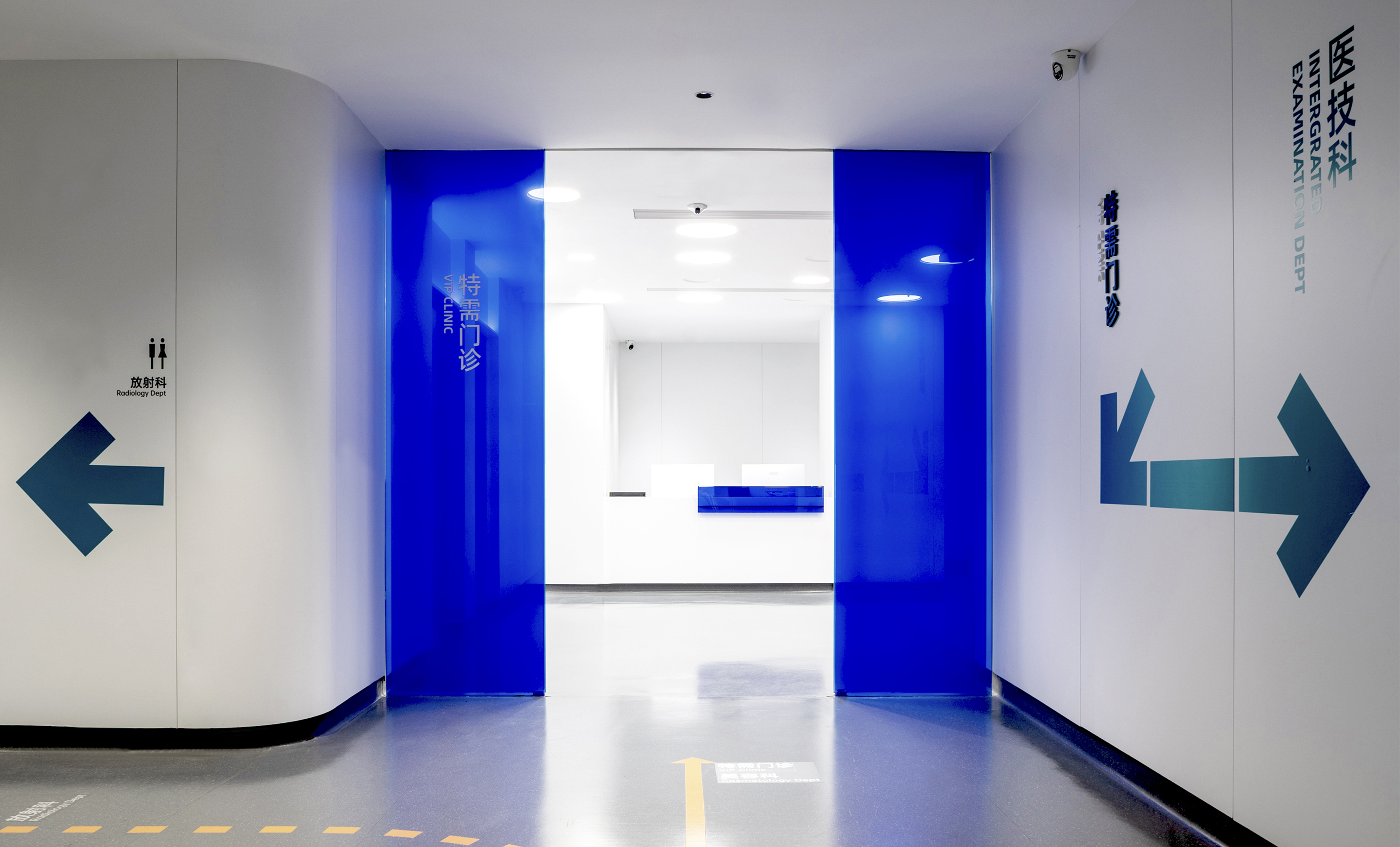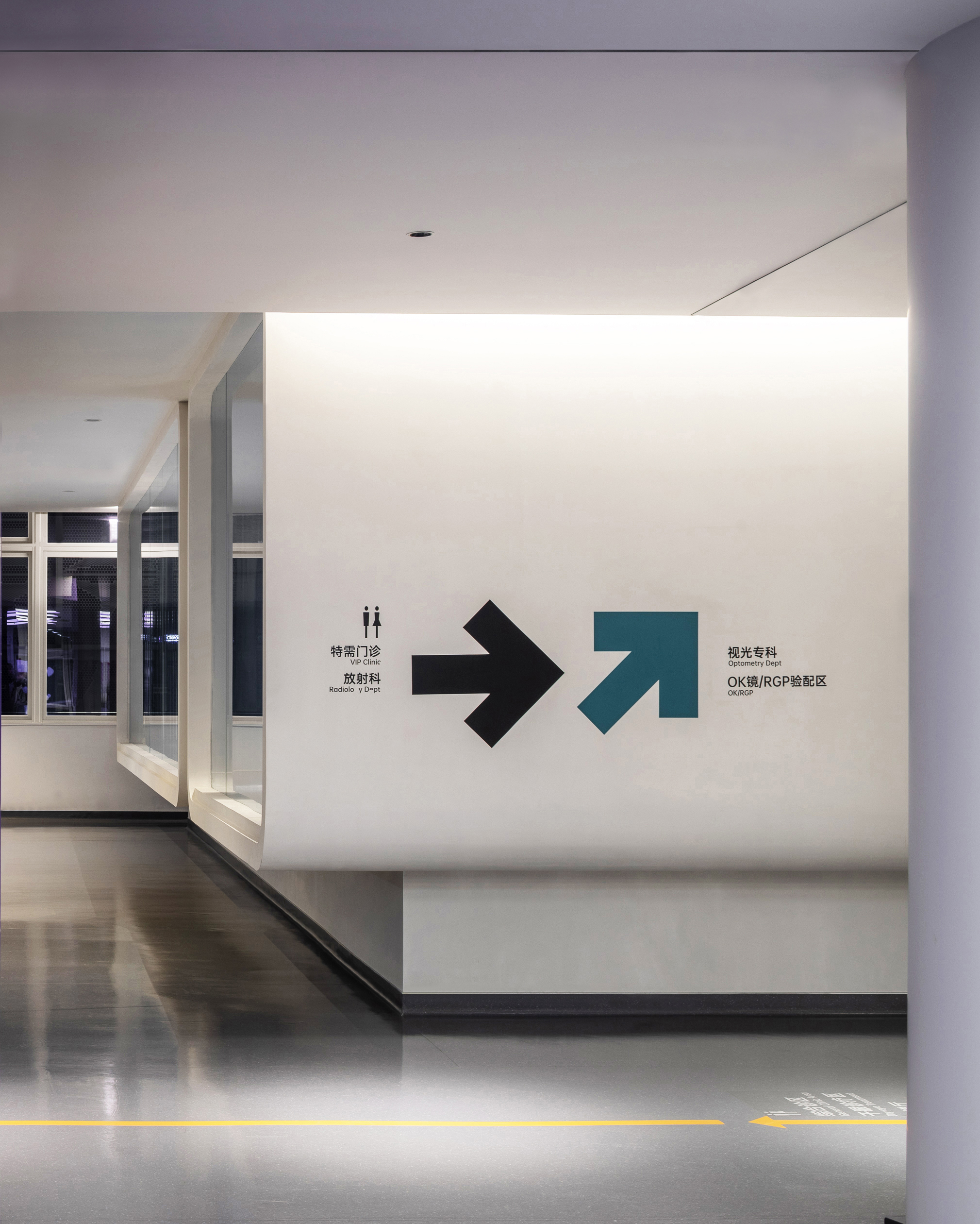 医院覆盖一至五层,我们以患者为中心,结合医院与商场、地铁公共交通的一体化布局,通过清晰的标识架构竖向、水平交通,系统规划急诊、门诊、手术、住院等不同需求动线。