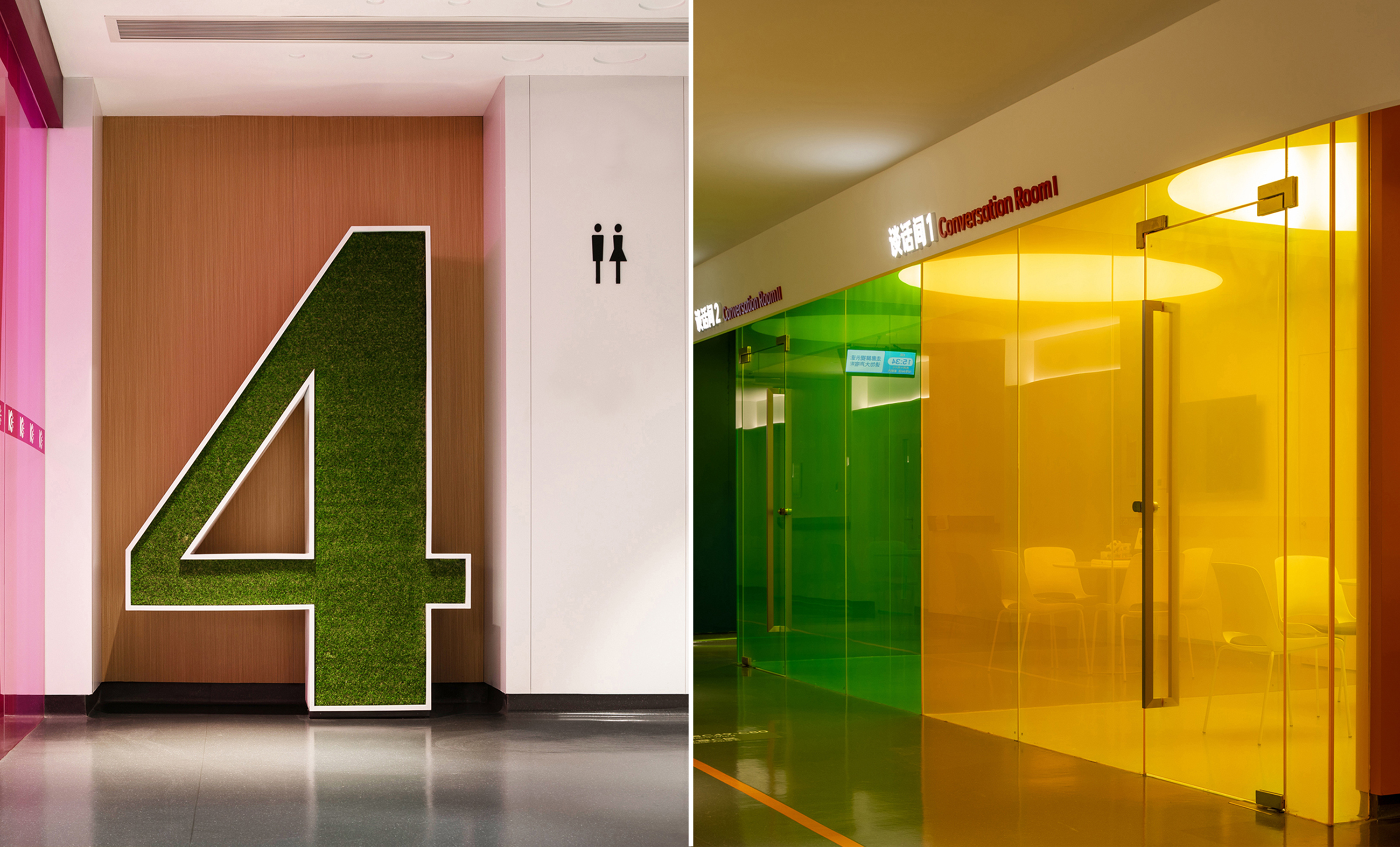在病房楼层,我们挖掘建筑特征与层高优势,适度保留原有结构关系,并通过艺术化设计将结构与护理站结合,形成独特的室内造型语汇,以明快色彩构成病房楼层公共区域,将住院转化为趣味体验,消除患者与医护人员之间的隔阂,使单调的住院生活变得生动而有趣。