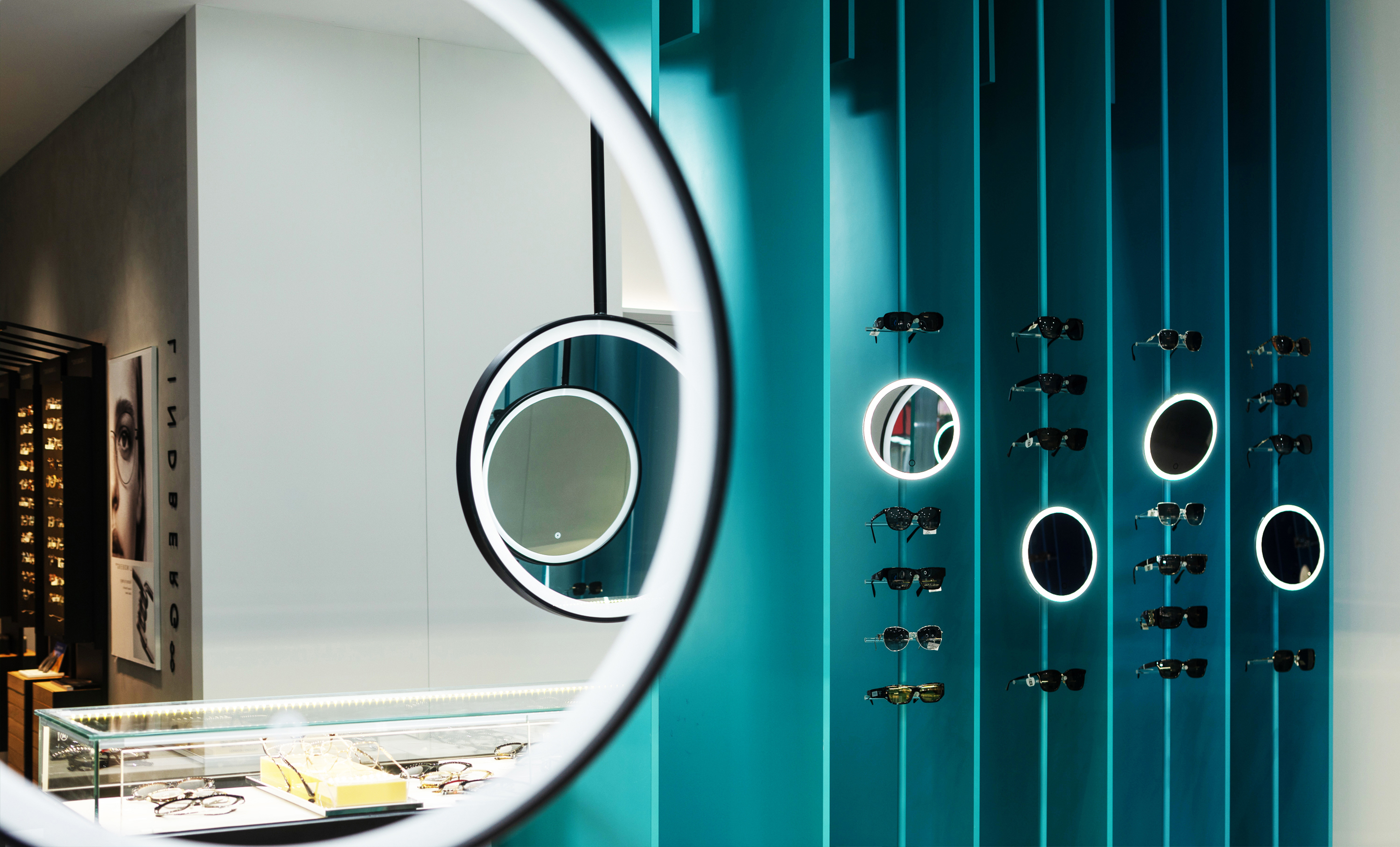 我们在一楼沿街主立面设精品眼镜展售区,采用蓝绿渐变玻璃展架,弱化玻璃幕墙生硬感。在自然光影变化下,凭借独特的光影与色彩构成,吸引顾客驻足拍照分享,有效提升了医院在社交媒体的传播度与品牌形象。