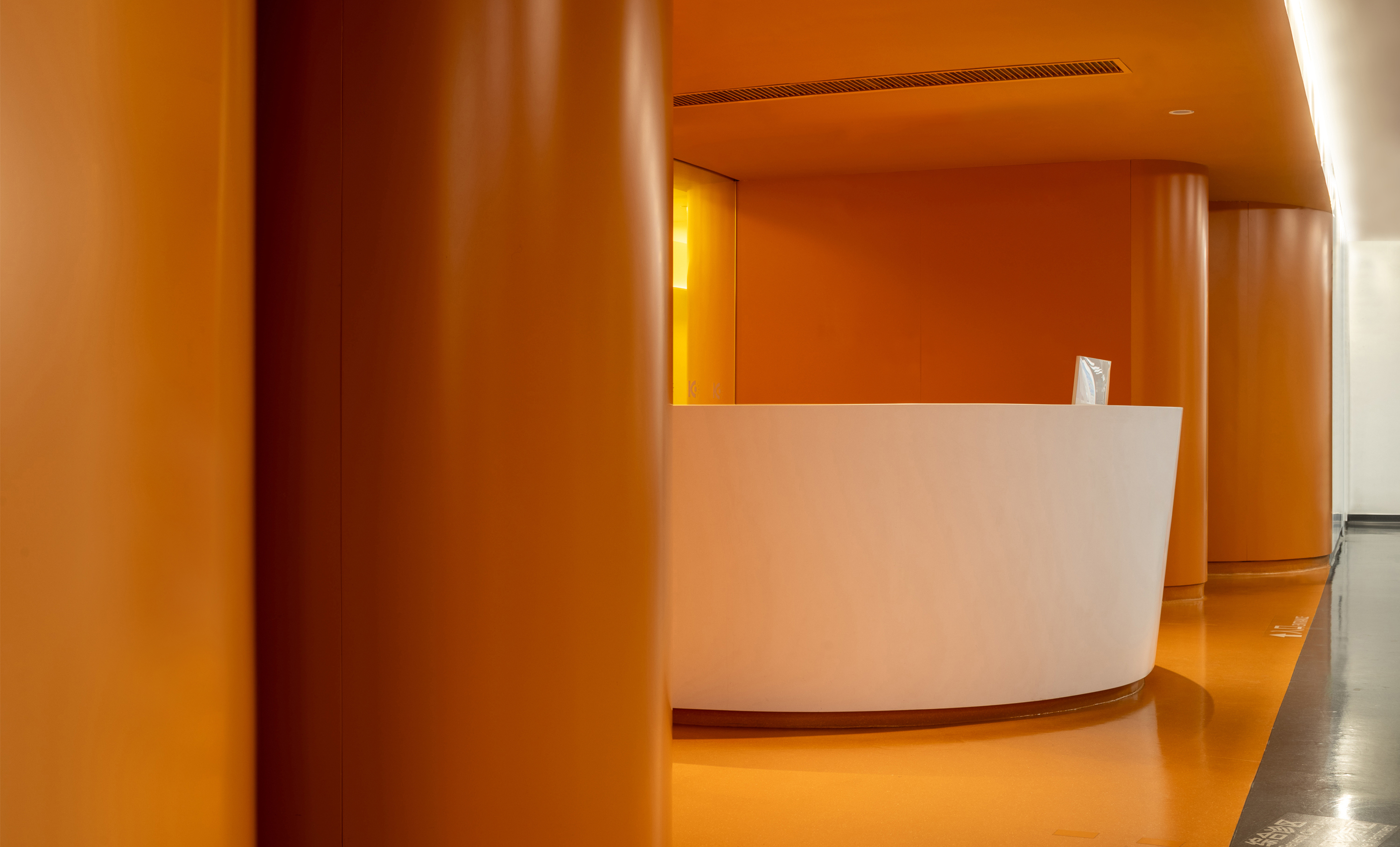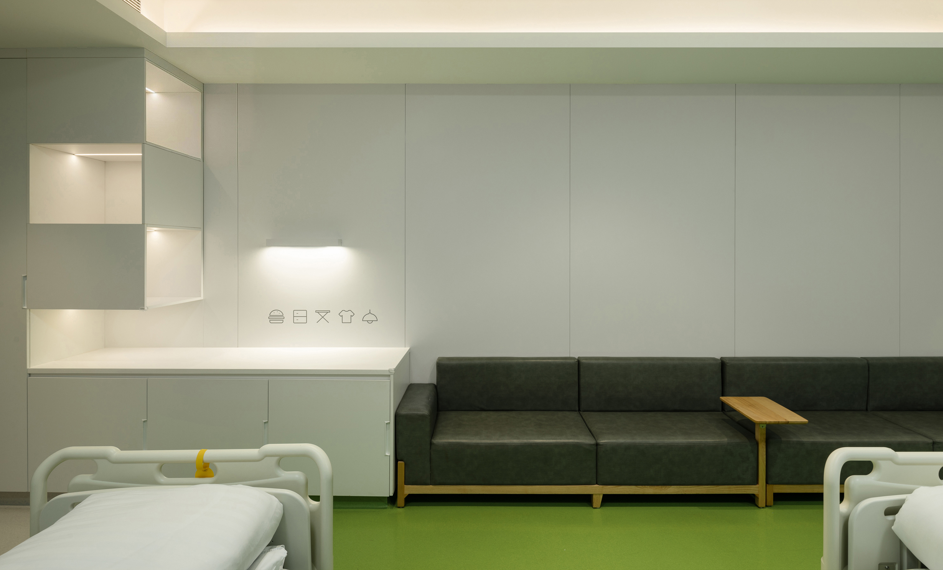 To mitigate the oppressive feel of the building's slanted steel structure, all spatial volumes and furniture follow the architectural language by adopting curved forms. This is paired with rich color-coded functional zones, which break the sense of enclosure from partition walls, infuse a soft ambiance, convey a warm texture, and alleviate the tense atmosphere typical of hospital environments.