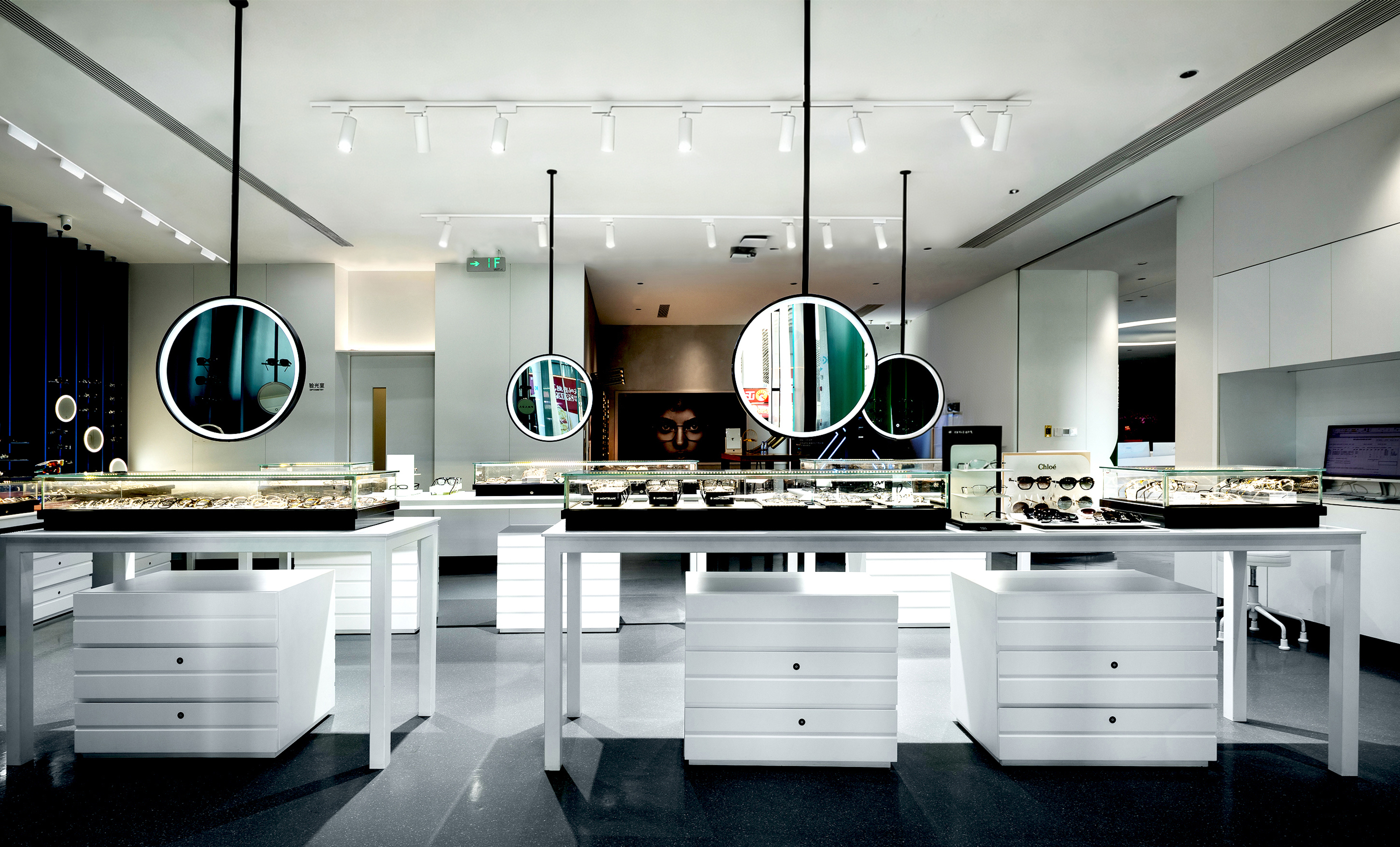 On the first floor, along the main street-facing facade, we established a premium eyewear display and sales area. Utilizing blue-green gradient glass display shelves, we softened the starkness of the glass curtain wall. Under the shifting natural light, the unique interplay of light, shadow, and color composition attracts customers to pause, take photos, and share their experiences. This has effectively enhanced the hospital's visibility on social media and bolstered its brand image.