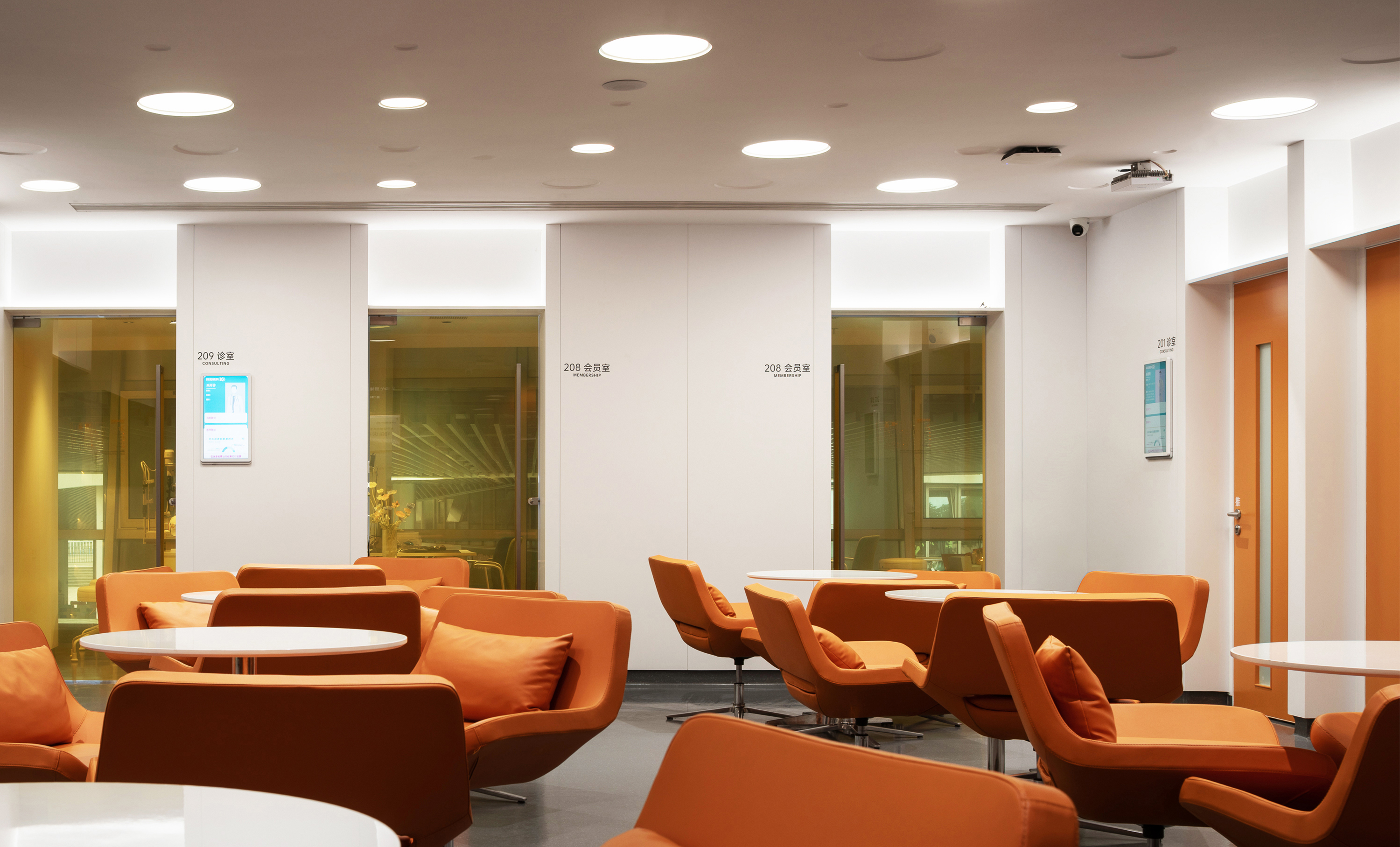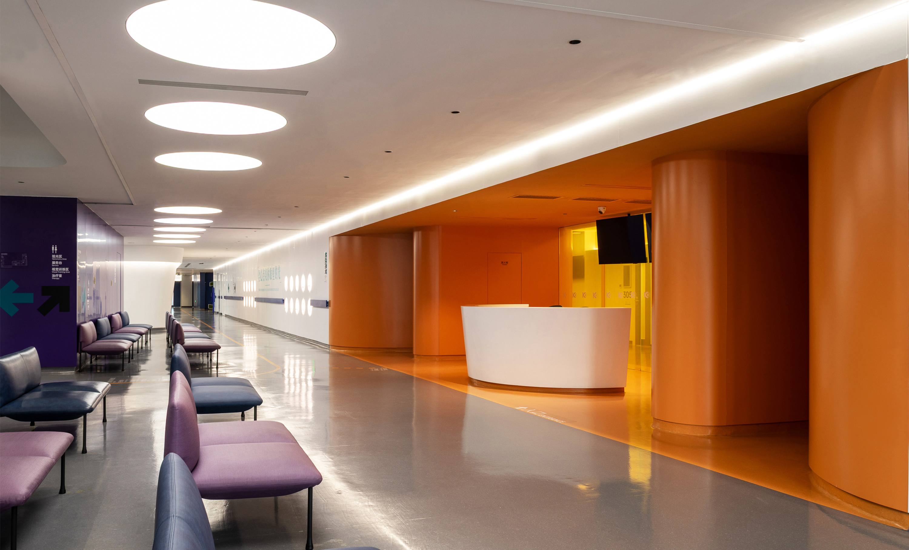 为弱化建筑斜向钢结构的压迫感,所有空间体块、家具均依循建筑语汇采用圆弧造型,搭配丰富的色彩功能分区,打破隔墙封闭感,注入柔和氛围,传递温暖质感,缓解医院环境紧张氛围。