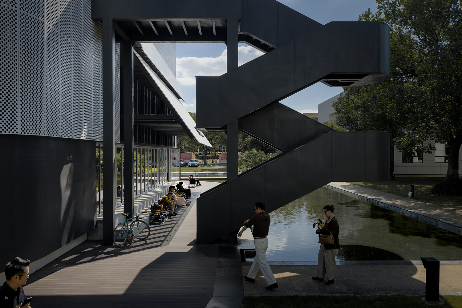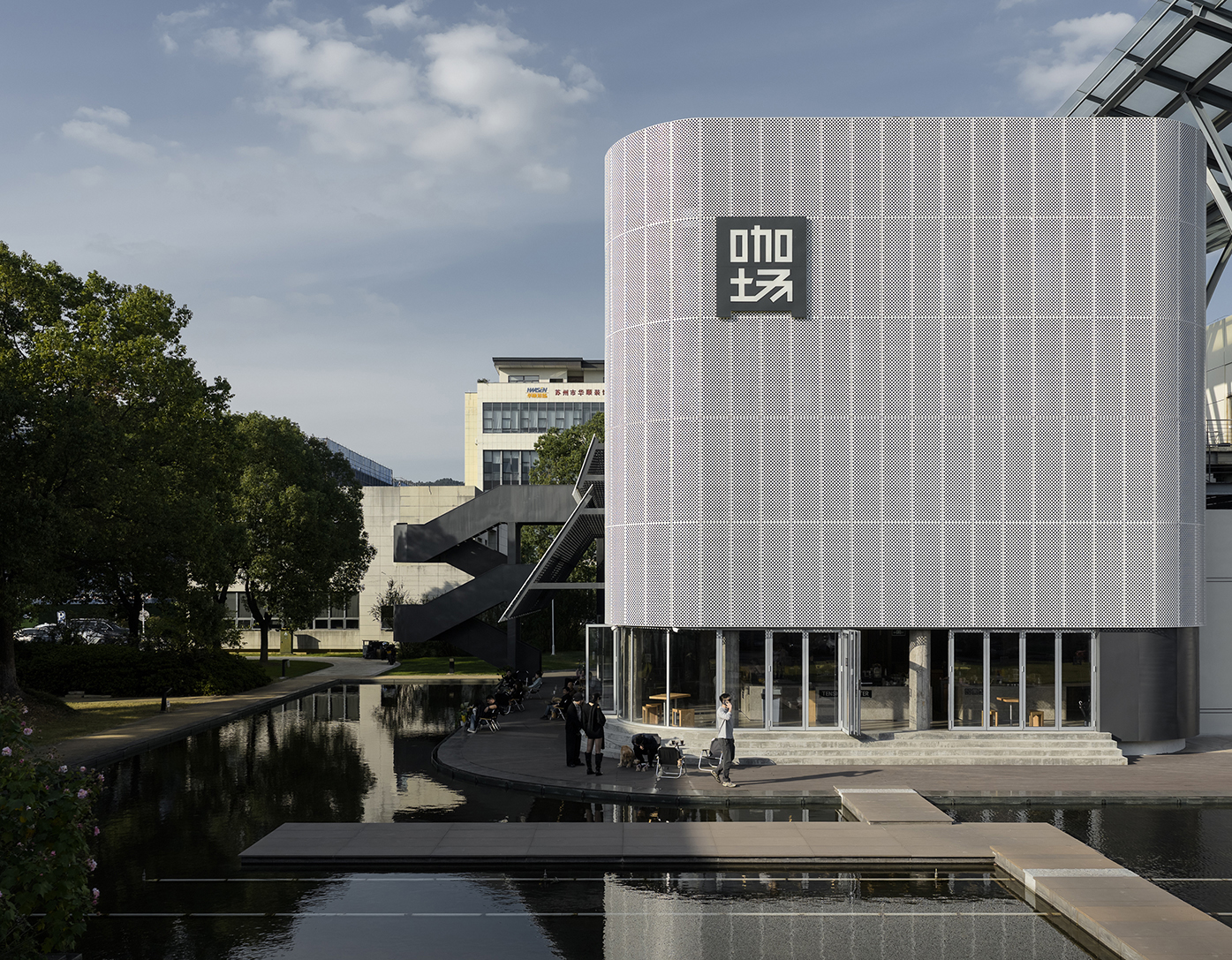 人们随性在空间中自由穿梭,可以端着咖啡流淌在空中廊道,俯瞰芸芸众生的样貌,也可以在檐下台阶上伸着腿感受池面里不断变化的天空、风的轨迹与时间的色彩,这里有着丰富的层次感与变化,它们静静地诉说着对生活的态度——轻松、随性、不刻意追求潮流,只愿按照自己的节奏和韵律,喝着咖啡悠然地走过每一天。