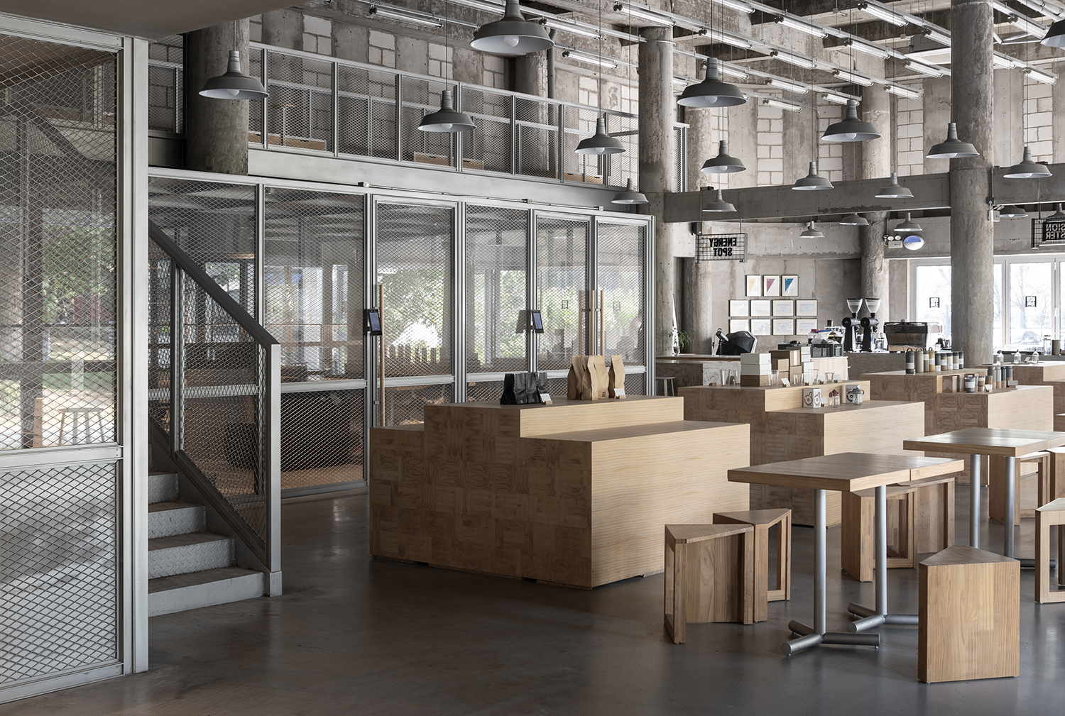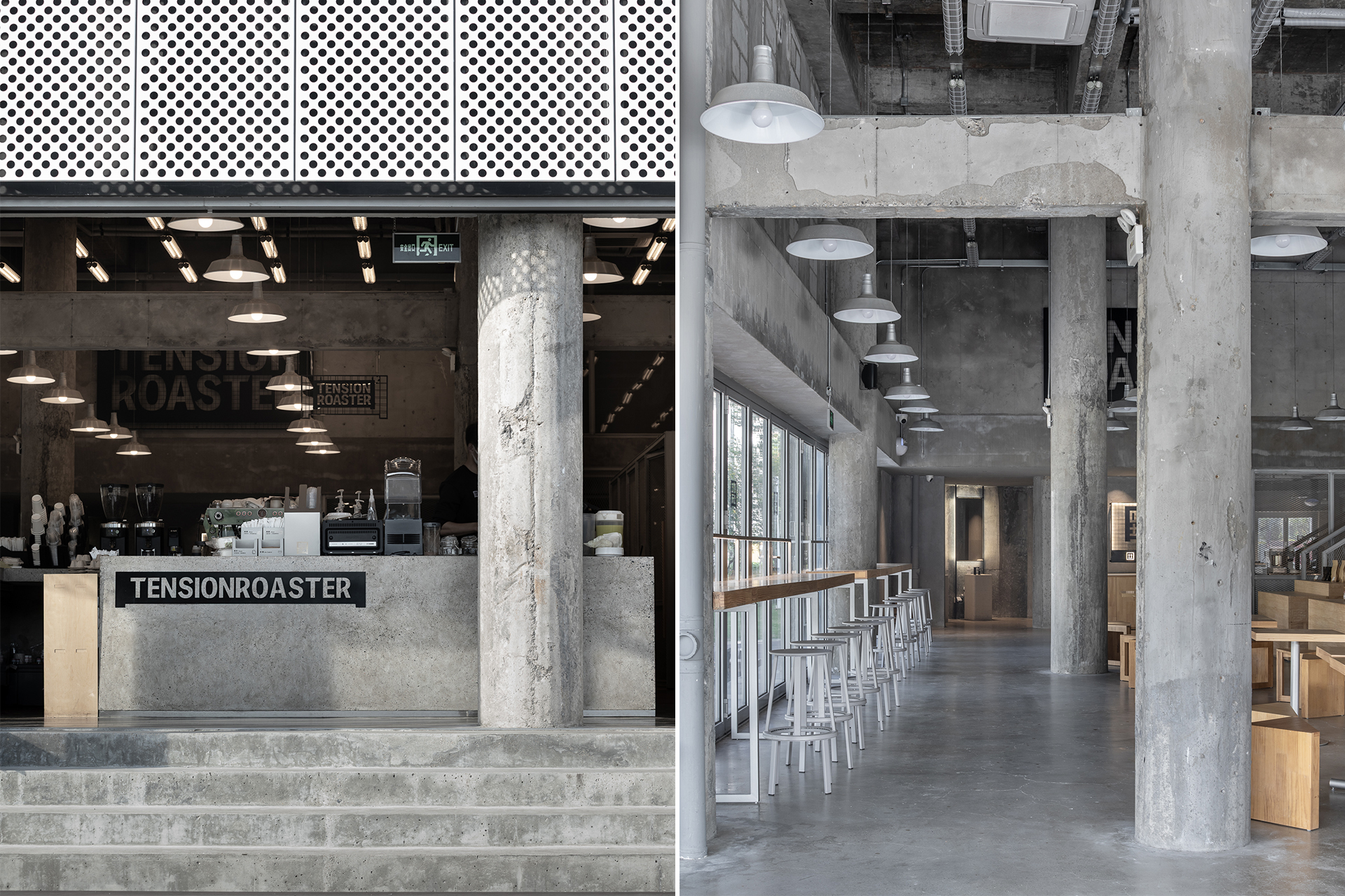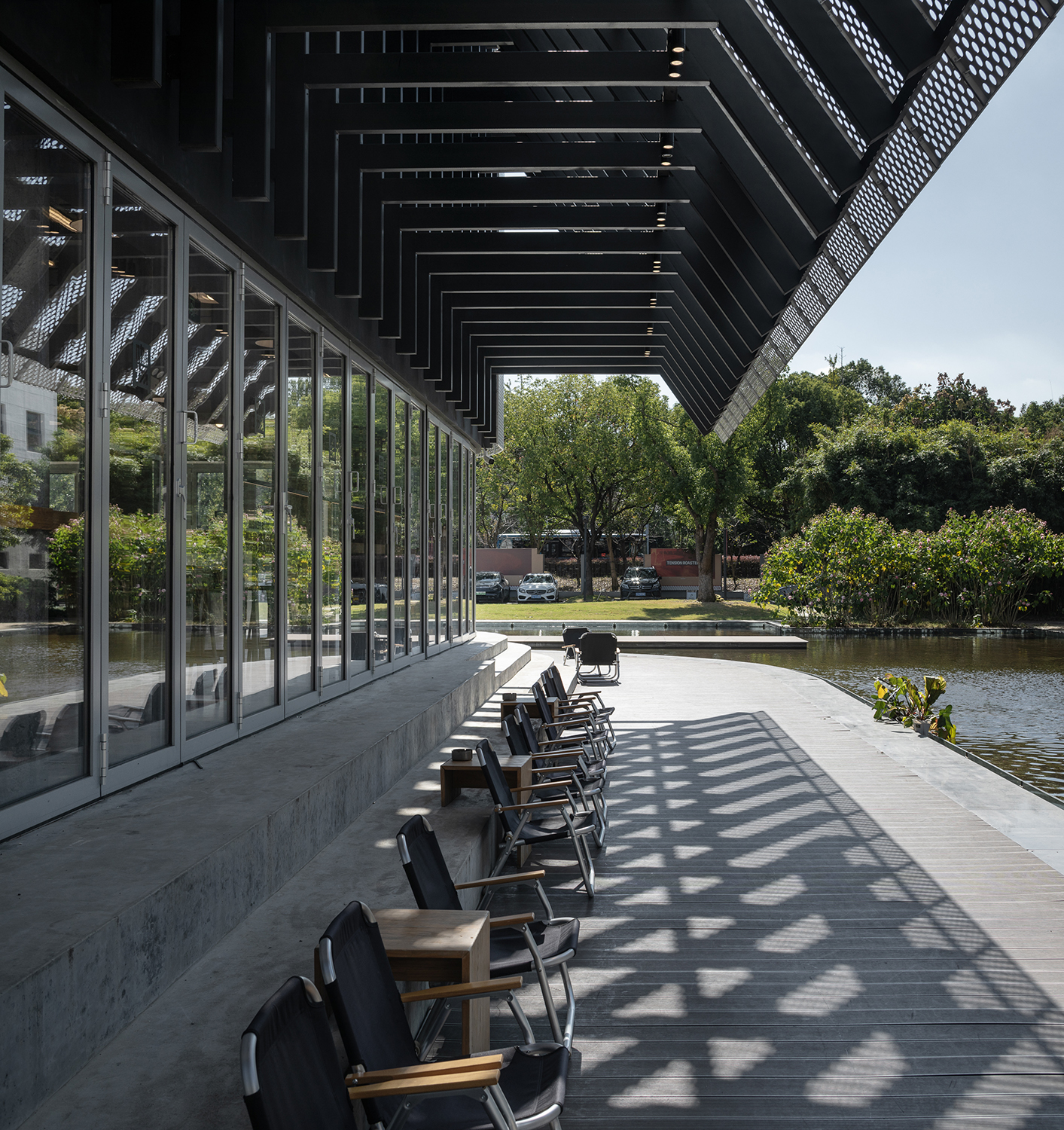 大面积的玻璃折叠门除了引入充足的自然光线,让室内外空间相互渗透融合,水池、外摆平台、檐下空间、点单区、内用区、咖啡烘焙区,空间关系由开放层层递进到私密、满足不同人群的社交需求。