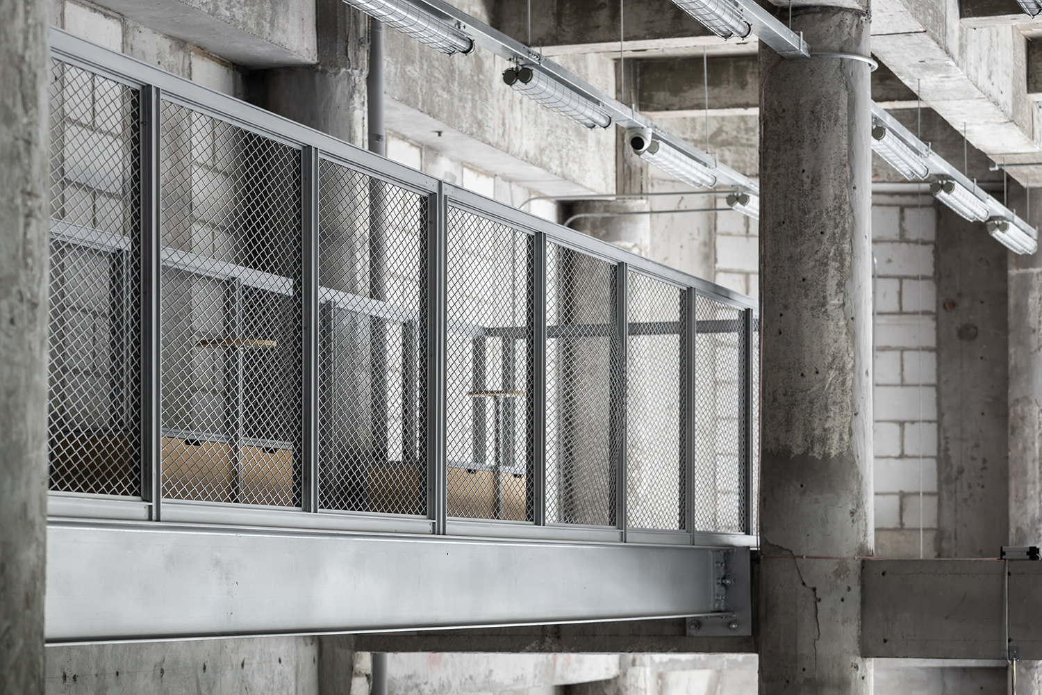 We removed the original curtain wall of the building and installed pure, minimalist, multi-layered white perforated panels to create a transcendent, light-permeable aesthetic.