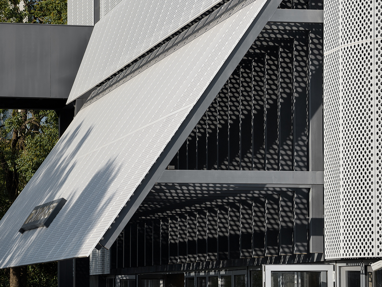 我们拆除原有建筑外墙帷幕,设置纯净、简洁而多层次形态的白色冲孔板,呈现出一种超然透光的美感。